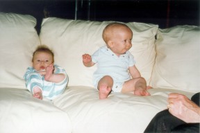 Here's Robert!It's been a while since we had any new pictures of Robert, (or anyone else for that matter) so Daddy got these. As you can see I am not the only bald baby in the family! (Although Stephen, shown on left, has more hair than Robert and I put together!) In this picture, Robert's parents have elected to hide his baldness. See how happy he is about it! |